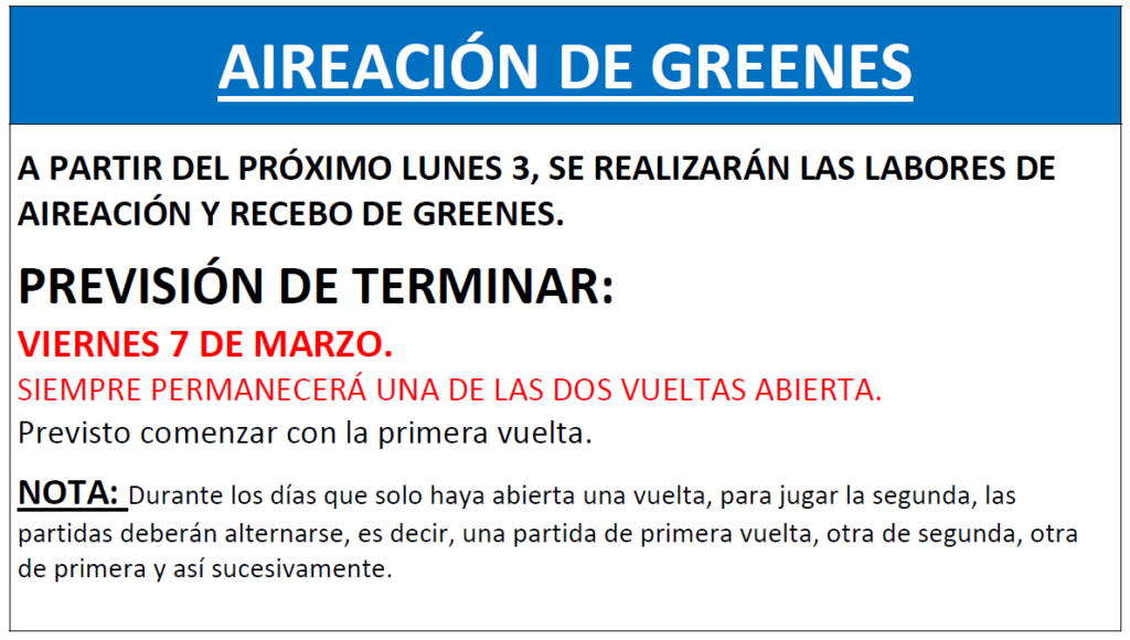 A partir del lunes 3 de marzo comenzaremos las labores de aireación y recebo de greenes. Siempre permanecerá una de las dos vueltas abiertas.