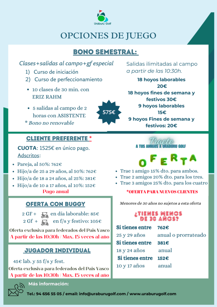 Recientemente hemos incorporado una nueva figura o modalidad de juego: Cliente preferente. Una fórmula de compromiso por un año que ofrece a los aficionados una serie de ventajas para la práctica del golf en nuestro club de forma individual o para toda la familia